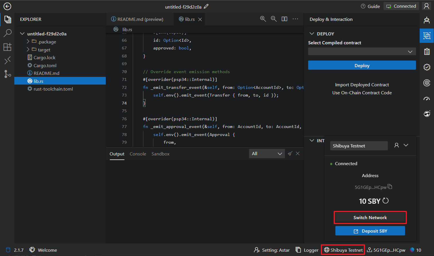 ChainIDE supports switching between four networks: Astar Mainnet, Shibuya Testnet, Shiden Mainnet, and Custom Network.