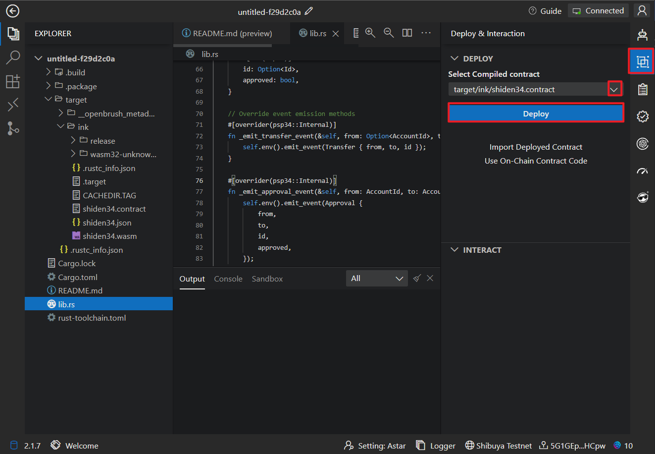 Before deploying the contract, you need to click on "Connect Wallet" in the upper right corner, choose your wallet, and use it to connect to the Astar blockchain.
